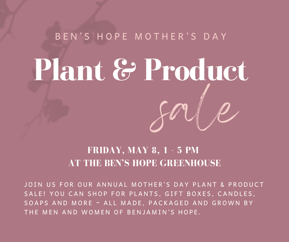 Join us at the Ben’s Hope Greenhouse on Friday, May 8 from 1-5 PM for our Mother’s Day Plant & Product Sale! You can shop for plants, gift boxes, candles, soaps and more - all made, packaged and grown by the Men and Women of Ben’s Hope. We hope to see you there!